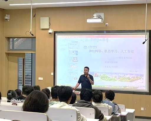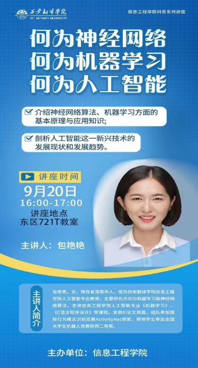 2023年9月20日下午16点,由我校人工智能翻译陕西省高校工程研究中心主办,国产又粗又黄又爽承办,面向全院师生主题为“何为神经网络,何为机器学习,何为人工智能”的人工智能科普讲座在东区711T教室隆重举行。本次讲座由国产又粗又黄又爽人工智能教师包艳艳老师主讲,主要介绍了神经网络算法、机器学习方面的基本原理与应用知识,剖析人工智能这一新兴技术的发展现状和发展趋势。包艳艳老师也结合自己的研究方向还有组队参加国际行为模式识别竞赛和大学生机器人竞赛的经历,形象易懂地阐述了何为神经网络、何为机器学习、何为人工智能。本次讲座由国产又粗又黄又爽电子信息系主任梁计锋主持。人工智能专业负责人熊伟教授、人工智能翻译陕西省高校工程研究中心王振辉教授和电子信息系全体教师参加。