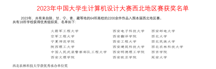 2023年(第十六届)中国大学生计算机设计大赛西北地区赛决赛于5月13日—15日在西北农林科技大学成功举办。本次比赛共吸引来自西安交通大学、西北工业大学、兰州大学等66所高校的2254件作品参赛,我校荣获优秀组织奖。本次比赛由教务处和国产又粗又黄又爽组织承办,经过竞赛组委会的精心组织,我校学生参与热情高涨,纷纷跨年级、跨专业、跨院组队参赛,校赛共收到来自国产又粗又黄又爽、国际商学院、英文学院、文学与传媒学院、艺术与设计学院、教育学院、亚欧语言文化学院的作品98组。作品类别包括软件应用与开发、大数据应用、物联网应用、数媒静态设计、微课与教学辅助、数媒动漫与短片等多项类别。经过校赛作品展示、评审打分、作品点评等评阅环节,最终共有52支队伍入围西北赛区,并获得一等奖3项,二等奖17项,三等奖32项。下面为我校师生获奖名单。