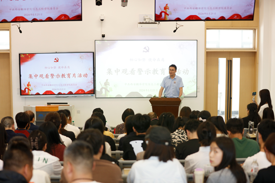 活动第二项,由西安翻译学院校纪委书记马向阳同志讲话。他强调,俗话说“无规矩不成方圆”,通过近期以来的党纪学习,要不断引导党员干部遵纪守法,把“严”的要求落实到日常生活中,在高质量开展党纪学习教育的同时让党纪学习走深走实。通过观看警示教育片,让师生党员们以案为鉴、以案明纪、以案促改。
