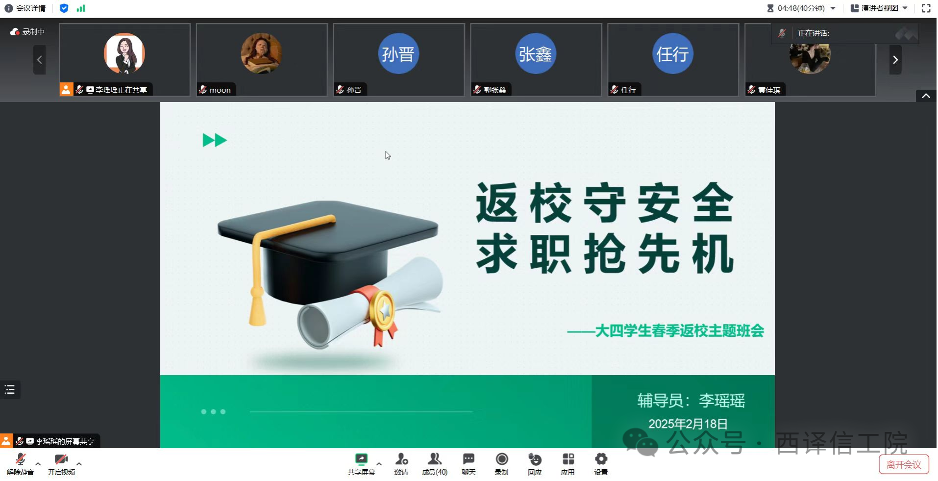最后,毕业班同学在辅导员的详细讲解下,明确了返校时间、请假流程以及安全注意事项。在求职方面,针对各就业赛道给出的建议,也为同学们指明了清晰的方向。同学们积极互动,踊跃提问,涉及实习请假与就业长假手续的衔接、考公备考资料的获取等问题,辅导员均给予了准确解答。