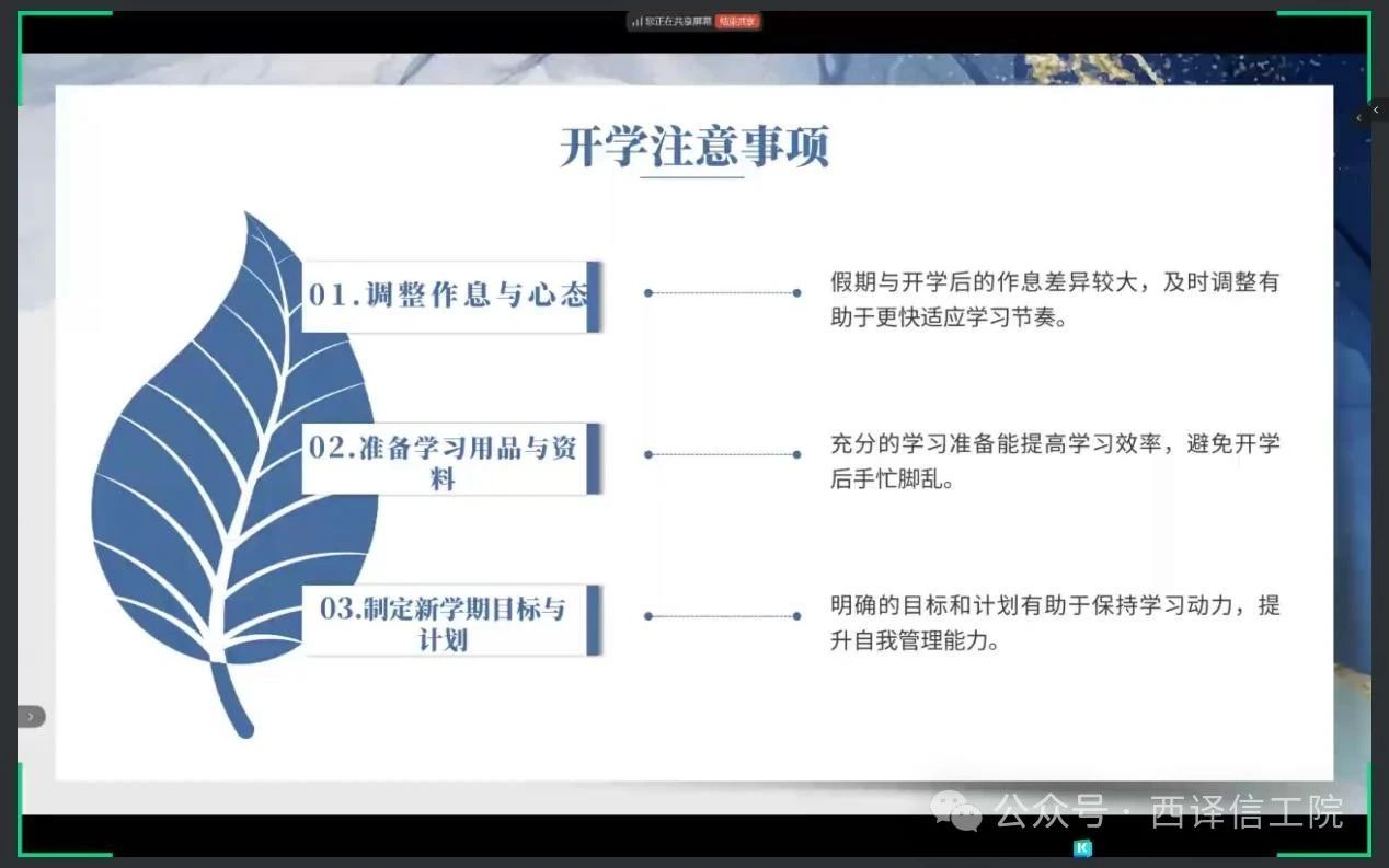 此外,辅导员还特别强调,处于换季期间目前学校地区气温较低,同学们要带厚衣服,注意天气变化,保护好个人健康,为同学们加油鼓劲,鼓励大家提前做好开学准备,调整作息时间,以饱满的精神状态、积极向上的心态迎接新学期的挑战。