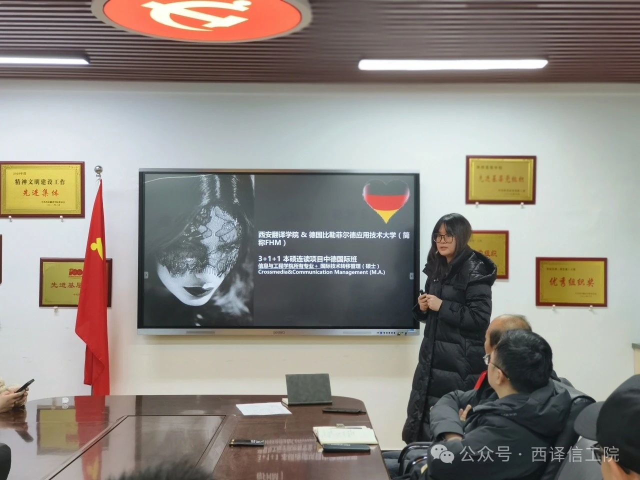 董琦对中德国际班项目(3 + 1 + 1 模式)进行了详细阐释。她讲到在该模式下,学生在德国第一年修读的课程学分,可按照相关规定转换为本科大四学年学分。第二年,学生将进行专业课学习并参与带薪实习。同时,她还提到该项目具备显著的就业优势,合作院校会为毕业生提供德企的就业推荐机会,使学生的就业得到有力保障,为学生未来的职业发展奠定坚实基础。