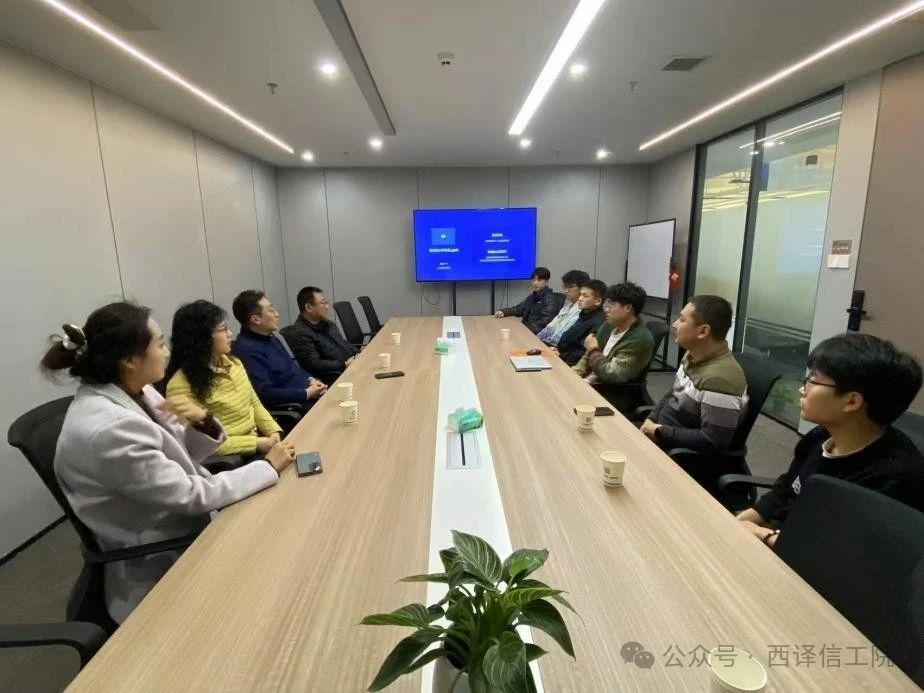 企业经理冯瑜对企业业务范围、发展历程、发展愿景进行了详细介绍,让学院一行人深入了解了企业的运营模式和行业定位。“阳光就业工程”项目负责人刘峰组织了正在企业实习的 6 名学生展开实习交流座谈会,学生积极分享了在实习培训过程中的真实感受与收获,总体反馈良好,他们表示,通过实际参与企业项目,不仅专业技能得到显著提升,对未来职业发展有了更清晰的规划。