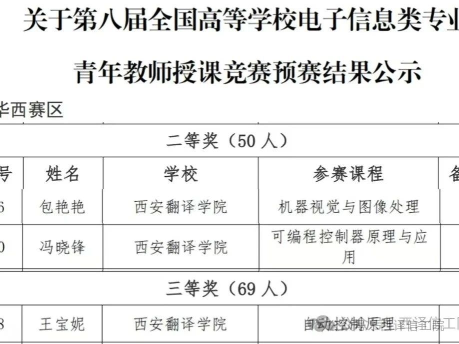 在第四届陕西省大学数学课程教学创新竞赛里,周婉娜老师荣获二等奖,王丹老师获三等奖;第八届高等学校电子信息类专业青年教师授课竞赛华西赛区,冯晓锋、包艳艳、王宝妮老师分获二、三等奖;第十二届全国高校电工电子基础课程实验教学案例设计竞赛(鼎阳杯)西部赛区,尤国强、梁计锋、梁瑞老师团队荣获两项一等奖、一项三等奖,创造学校在该赛事的最佳成绩。这体现了学院教师扎实的教学功底和不断追求卓越的精神。