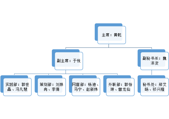 西安翻译学院工程技术学院学生分会下设5个部门,包括秘书处、实践部、网宣部、策划部、外联部。本着“端正态度,明确责任,锻炼素质,服务同学”的原则,各部门在团总支书记的领导和团委的指导下团结协作、通力配合,积极完成各项任务,共建良好的团学组织氛围。