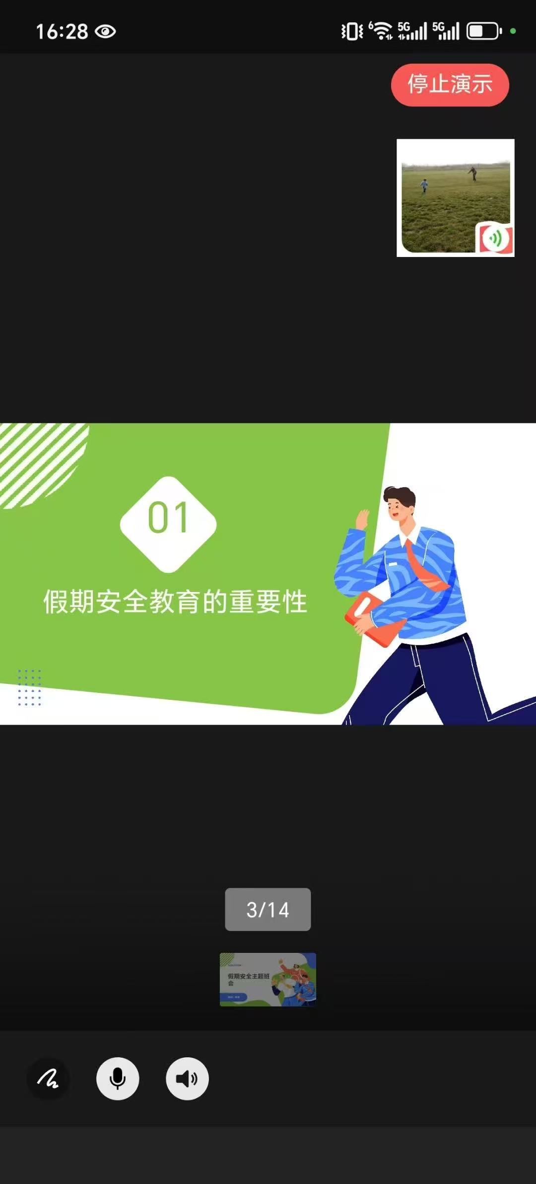 针对全体假期留校学生的线上安全主题班会召开,辅导员薛蓉围绕“假期安全”核心,系统阐述安全教育重要性,梳理交通、水上、家庭、网络等领域常见风险:从遵守交通规则、预防溺水事故,到家庭防火防盗、保障食品安全,再到强化网络信息保护、识别诈骗陷阱,全方位覆盖假期安全场景,并通过应急技能讲解与防范策略指导,提升学生自我保护与应急处置能力。