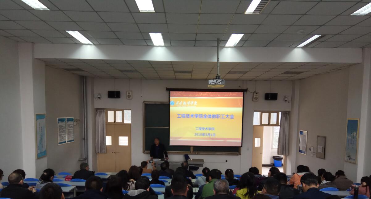2018年3月1日上午,工程技术学院在723T教室召开了新学期全体教职工大会,传达了学校2017-2018学年第二学期干部大会精神,并布置了各项具体工作。会议由马恒升院长主持。