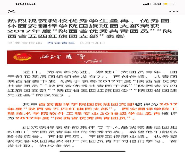 5月8日,共青团西安翻译学院委员会发布表彰决定,我院团总支被授予2018年度“五四红旗团总支”称号,这是继2017年度被授予五四红旗团总支”称号之后,我院团总支再次获得这一殊荣。“五四红旗团总支”是我校授予基层团组织的最高荣誉,这充分说明了学校对我院共青团工作的充分肯定。