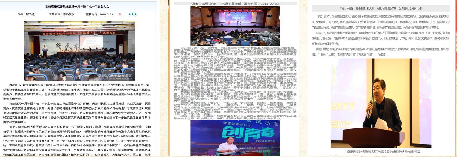 | | 我院团学青承办学校“七一”表彰、“创青春”陕西省青年创业大赛、2018年度双创年度总结暨2019年度双创工作启动仪式等活动 |
