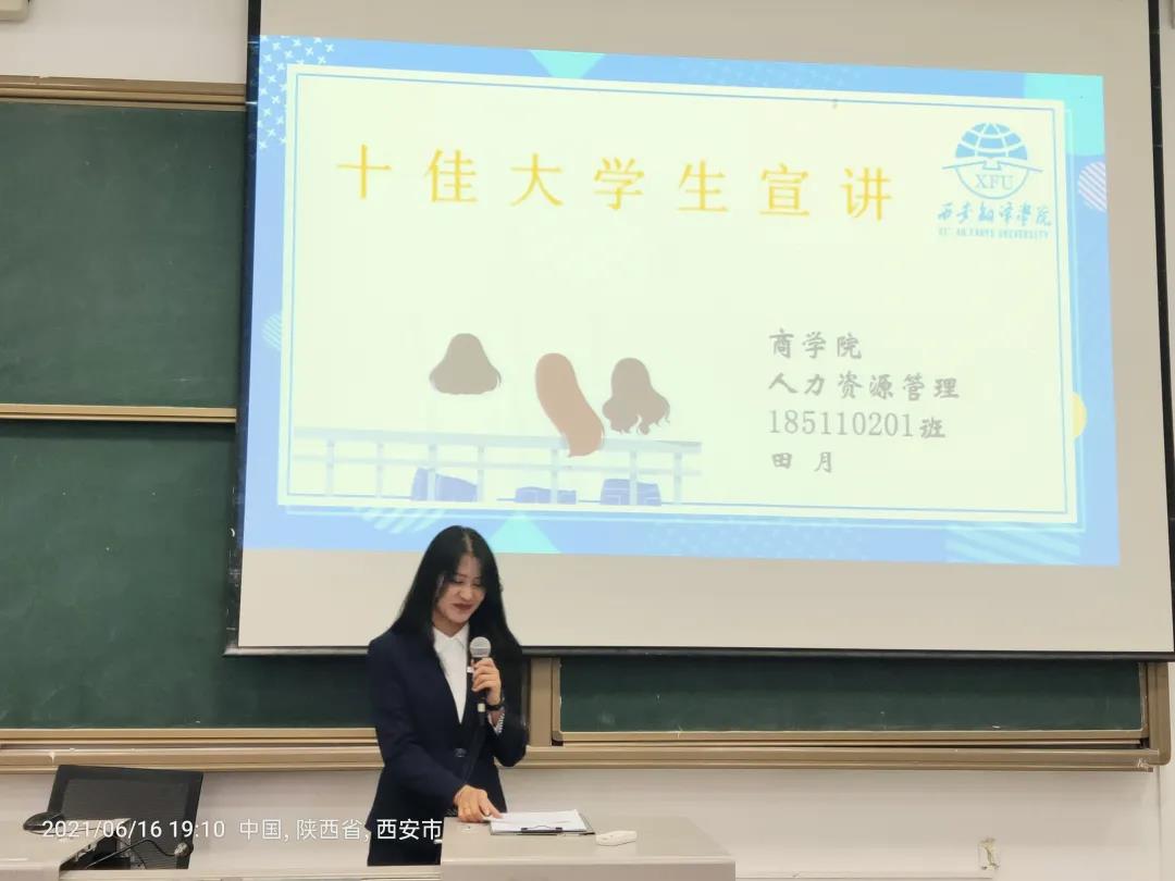 然后,十佳大学生商学院田月做了经验交流。她作为班上的学习委员,以身作则,带领班级同学积极投身创新、发展之路,为建设优良学风贡献青春力量;同时也积极投身志愿服务,支教、双百工程都能看到服务的身影,成功入选十四运赛会志愿者,只为担起服务社会的时代责任。追风赶月莫停留,平芜尽处是春山。同时,她分享给与会师生怎样更好地进行英语学习的方法,就是要制定单词复习计划、定量阅读、阅读扩展。