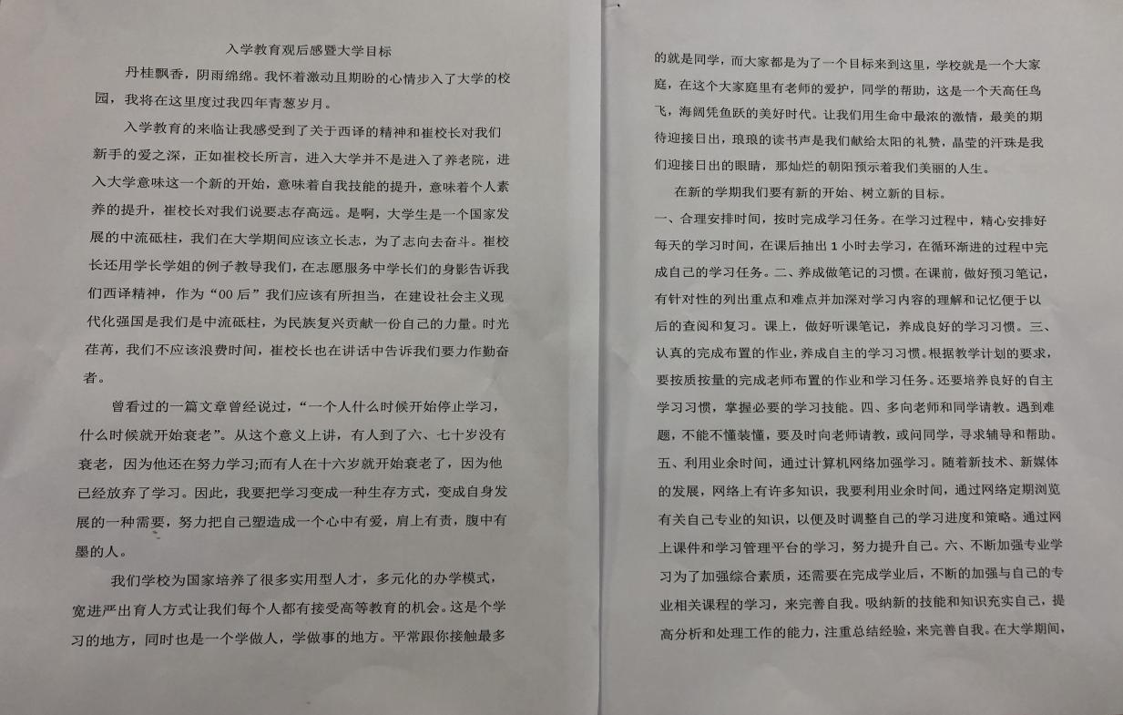 入学教育使我了解了学院的过去,现在与未来。西译是一个管理严格但爱生如子的大学,入学教育使我受益匪浅。在这里,我们将接受系统的理论知识,培养自立自强的人格。想要在一个陌生的城市里立足生存,最好的资本就是你的知识,就要好好学习,多少大山深处的孩子想走出大山改变自己的命运,现在学习就是为将来的生活积累资本。这座古城很美,我想,这城市夜色多朦胧,那一盏灯为一所心动,大千世界灯红酒绿,未来的我该是什么模样,是继续研读或是有稳定工作,在造价路上勤勤恳恳?最后,让我们扬帆起航,勇往直前。西译人,加油!
