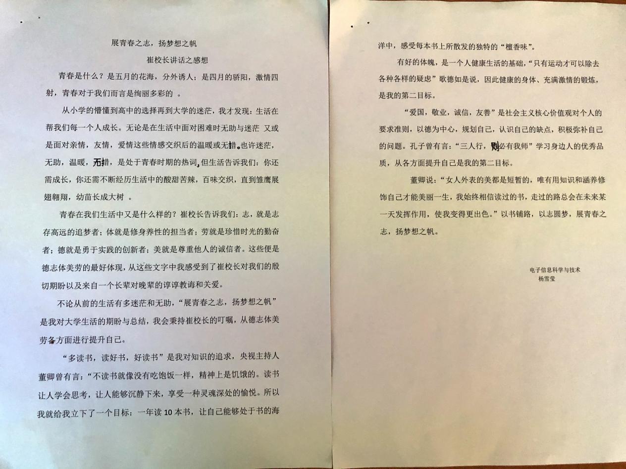 带着对未来的憧憬和对梦想的偏执,我走进了这所以读书,做人,变革,奋进为校训的书香校园,初入校园,外观如一本展开的书的建筑吸引了我的眼球,并深深烙印在我的脑海,之至崔校长在开学典礼告诉我们,我才懂的志的涵义:志存高远的追梦者。这八个字间接给我播种了一颗名为志的种子,我期待在以后的日子,能以汗水作为水分;以信念作为土壤;以梦想作为养料,就如我们伟大主席毛泽东所说:“孩儿立志出乡关,学不成名誓不还”以书铺路,以志圆梦,展青春之志,扬梦想之帆。