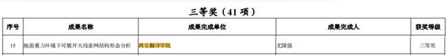 近日,陕西省教育厅发布了《陕西省教育厅关于公布2022年度陕西高等学校科学技术研究优秀成果奖的通报》(陕教函〔2022〕203号)文件,全省共评出优秀成果360项,我校工程技术学院尤国强博士的成果《地面重力环境下可展开天线索网结构形态分析》荣获三等奖,此次是我校首次获得该奖项,实现了我校历年来该奖项零的突破。