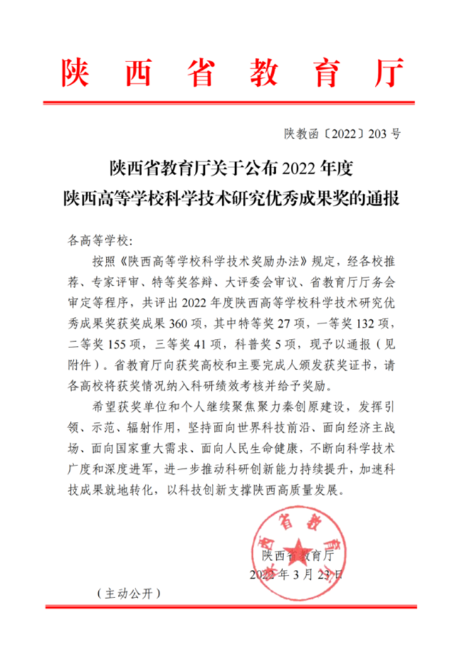 “陕西高等学校科学技术研究优秀成果奖”为省教育厅奖项。获得此奖项,说明该研究成果在科学技术指标上已达到国内先进水平,学术界公认程度较高,对学科发展和本行业领域技术进步具有推动作用,对经济建设和社会发展起到了一定的促进作用。此次获奖,既是对我校科研工作成绩的认可,也是对获奖教师科研水平的肯定。西译广大教师将会以此为动力,积极投入科研,未来在科学技术相关领取得更多、更大新突破。