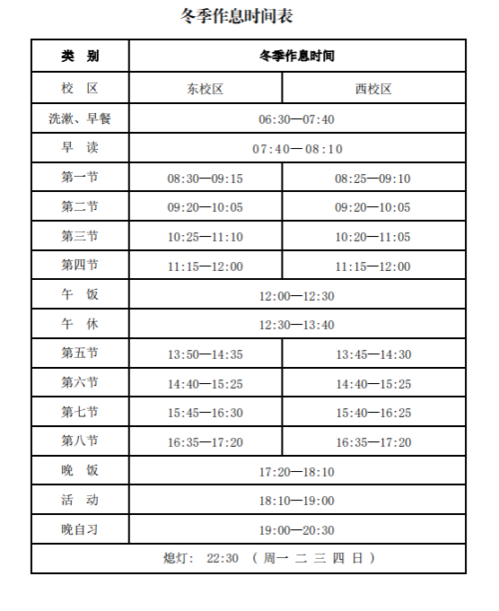 附件:西安翻译学院冬季作息时间表