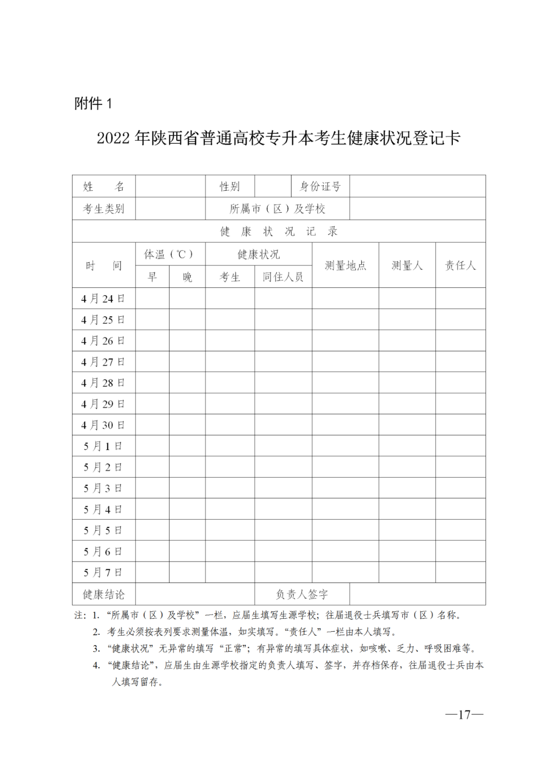 各生源学校要按照《大专院校新冠肺炎疫情防控技术方案》(国卫办疾控函〔2020〕304号)要求,负责做好本校考生专业课考核、报名、身份验证、信息采集、资格审查等各个环节的防疫工作。考前14天,建立考生健康状况登记卡(见附件1),认真填写并存档。