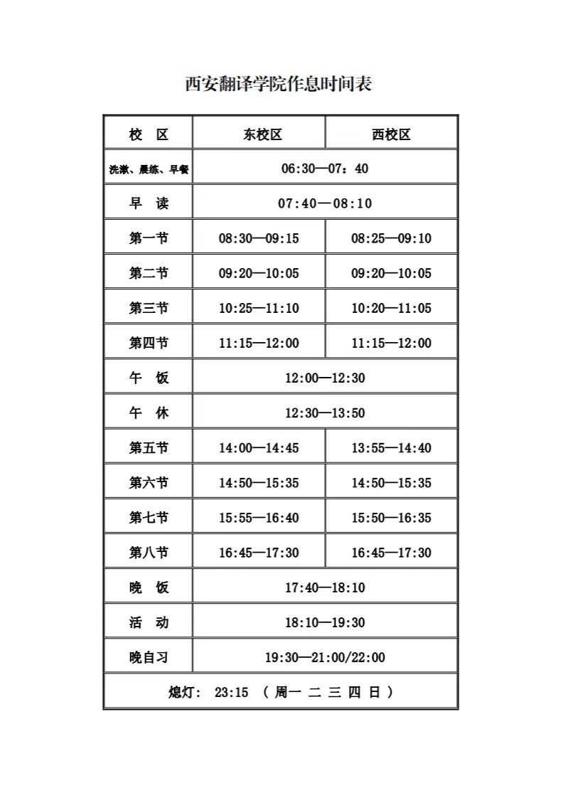 西安翻译学院作息时间表(2022年10月8日起执行)